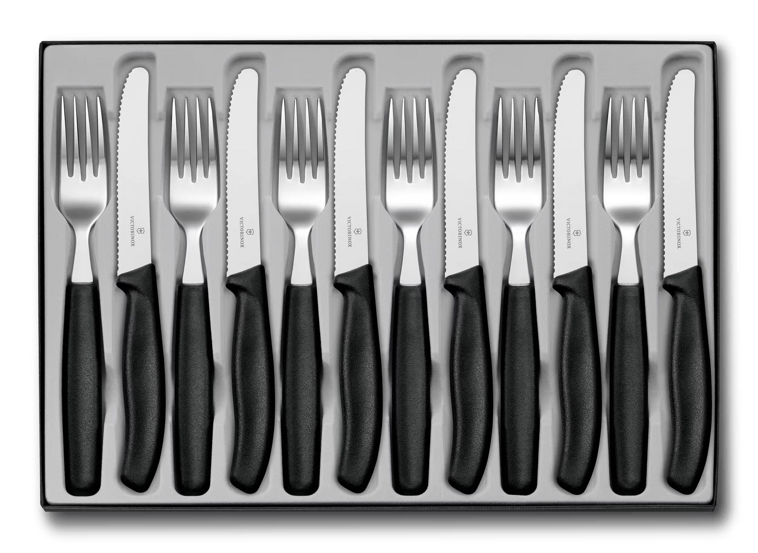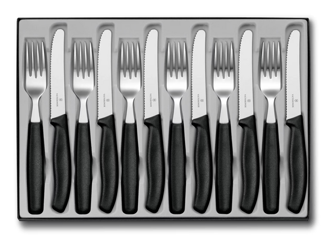 12 Piece Table Set, Wavy Edge - Black by Victorinox is a sophisticated and practical cutlery collection ideal for daily family meals and small gatherings. Featuring 12 pieces including wavy edge table knives and matching forks, each piece is crafted with ultrasharp, wear-resistant stainless steel blades for smooth, effortless cutting.