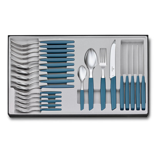 able Set (Tomato Knife), Wavy Edge 24 Piece - Cornflower by Victorinox is a stylish and practical cutlery collection designed for everyday family dining with vibrant elegance. This 24-piece set includes 6 tomato knives with ultra-sharp wavy edge blades, specifically crafted to effortlessly slice through tough tomato skins without crushing the soft flesh.