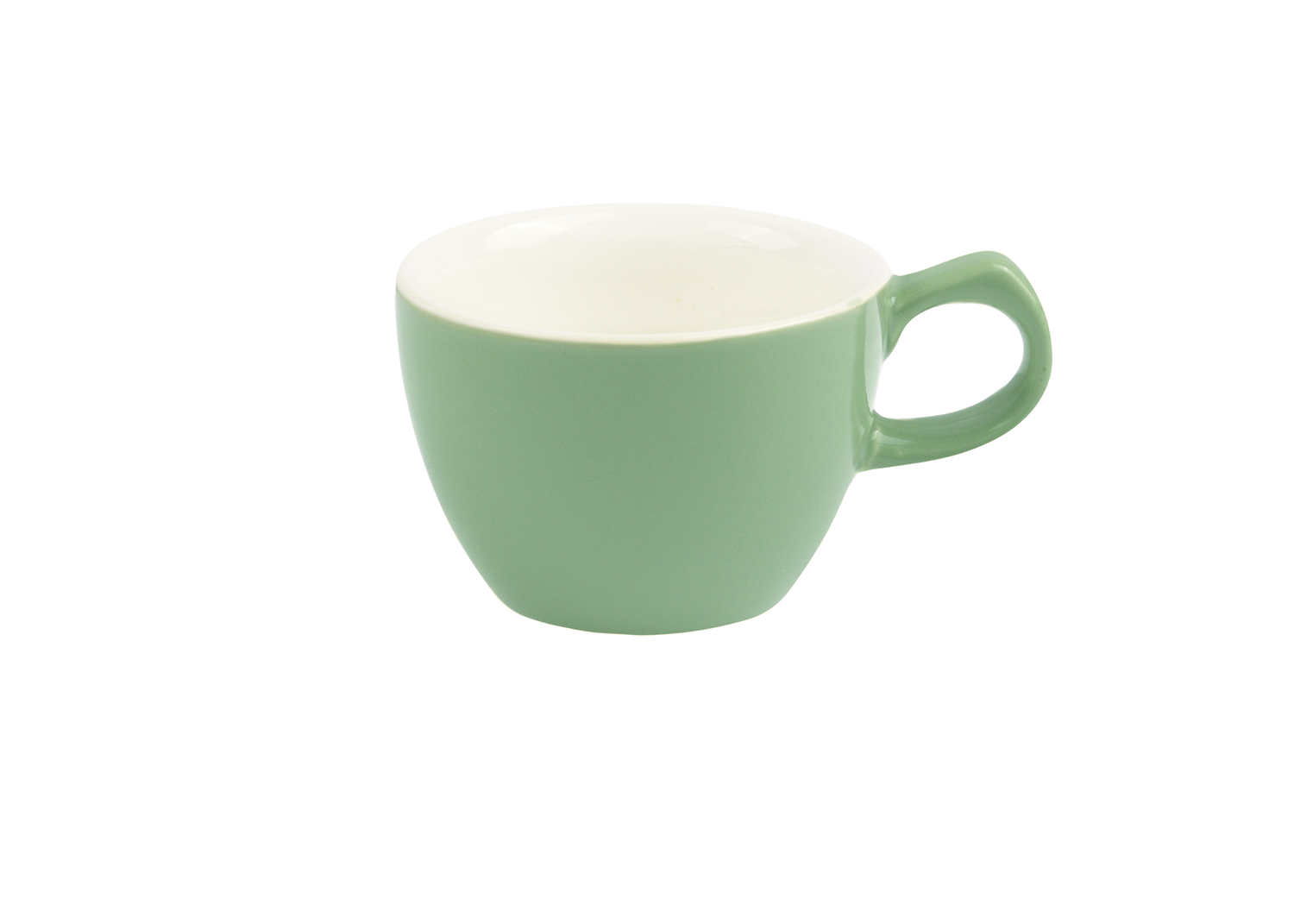 Lusso collection - offers a fresh and vibrant addition to your coffee experience, crafted from high gloss porcelain in a lively Mint green color. Designed with thickened walls for excellent heat retention, this cup keeps your coffee warm longer, enhancing every sip. The carefully crafted handle allows for easy stacking, maximizing storage efficiency without sacrificing style. Durable and dishwasher safe, this set is ideal for both professional hospitality settings and stylish home use, combining modern elegance with practical functionality to elevate every coffee moment.