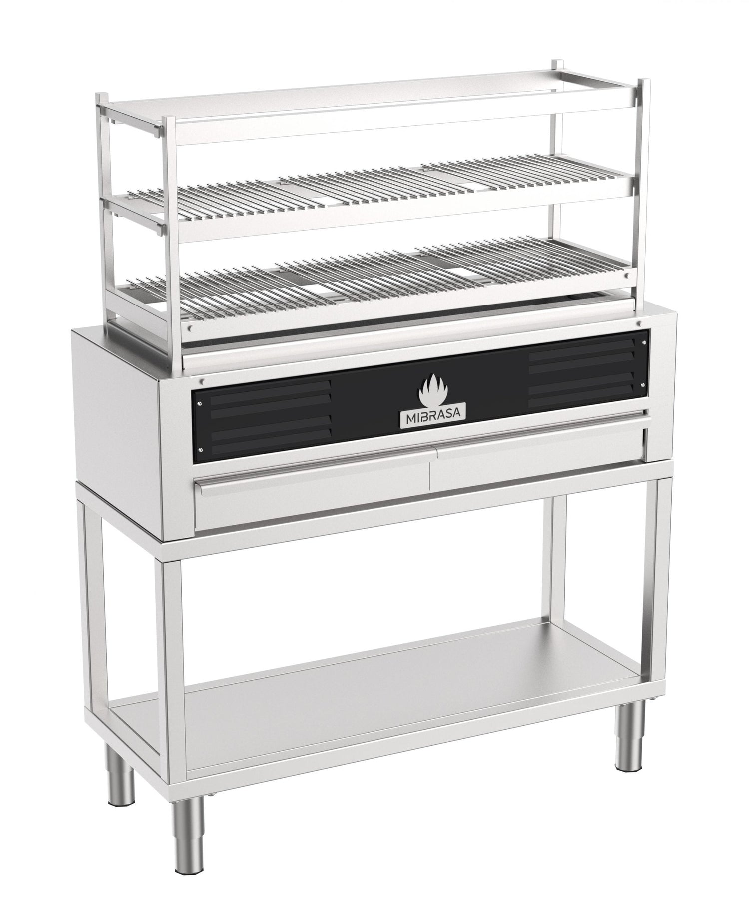 A premium commercial multi-tier open charcoal grill inspired by authentic Japanese Robatayaki grilling traditions. This robust stainless steel charcoal grill features three fixed tiers, providing ample and versatile cooking space to sear, grill, and rest a wide range of ingredients including meats, seafood, and vegetables, all while infusing a distinctive, light smoky flavor.