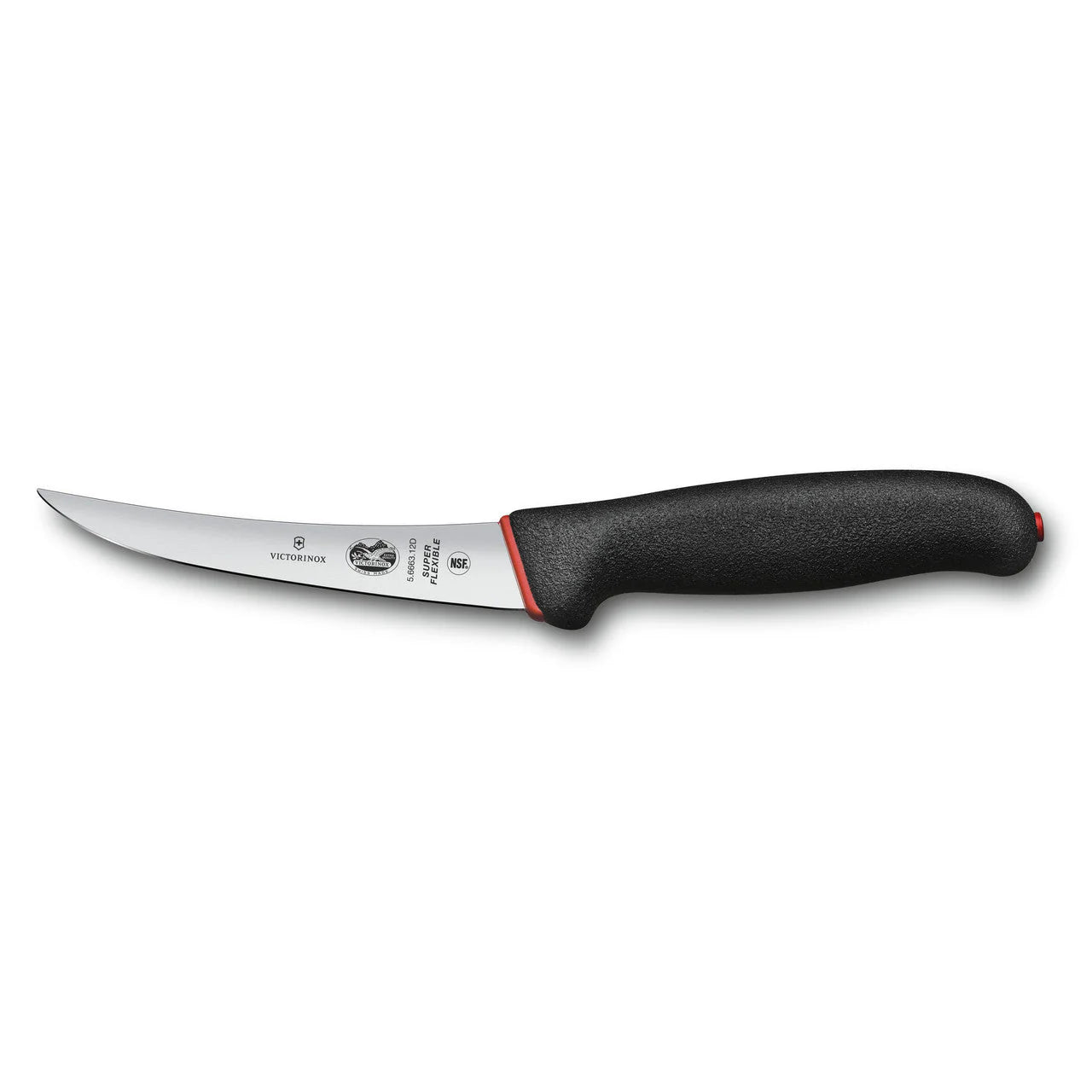 Boning Knife, Curved Super Flexible Narrow Blade 12cm - Dual Grip by Victorinox is a professional-grade knife designed for precision and control in deboning meat, poultry, and fish. It features a 12 cm curved, super flexible narrow blade made from high-quality stainless steel, allowing for smooth, effortless cuts that closely follow the bone structure without damaging the meat.