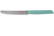 Tomato and Table Knife, Wavy Edge 11cm - Mint is a versatile and stylish kitchen knife designed specifically for slicing fruits and vegetables with tough skins and soft interiors. It features an ultrasharp, wear-resistant stainless steel blade with a wavy serrated edge that cuts effortlessly through tomatoes, melons, and similar produce without crushing them. The blade length is 11 cm, ideal for precision and control in everyday kitchen tasks. The handle is crafted from durable polypropylene copolymer (PPC) in a fresh mint green color, offering an ergonomic, slip-resistant grip designed for comfort and safety. This Swiss-made knife combines modern aesthetics with practical performance, is dishwasher safe for easy maintenance,