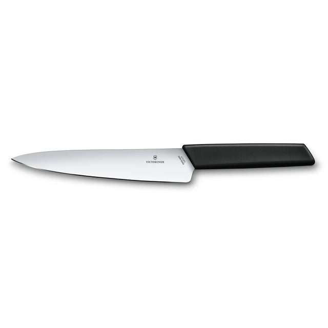 The handle is made of ergonomic polypropylene copolymer (PPC) in sleek black, providing a comfortable, non-slip grip with a balanced feel for effortless control. Swiss-made with precision craftsmanship, this carving knife combines durability and elegant design, suitable for both professional chefs and home cooks. It is dishwasher safe for easy maintenance.