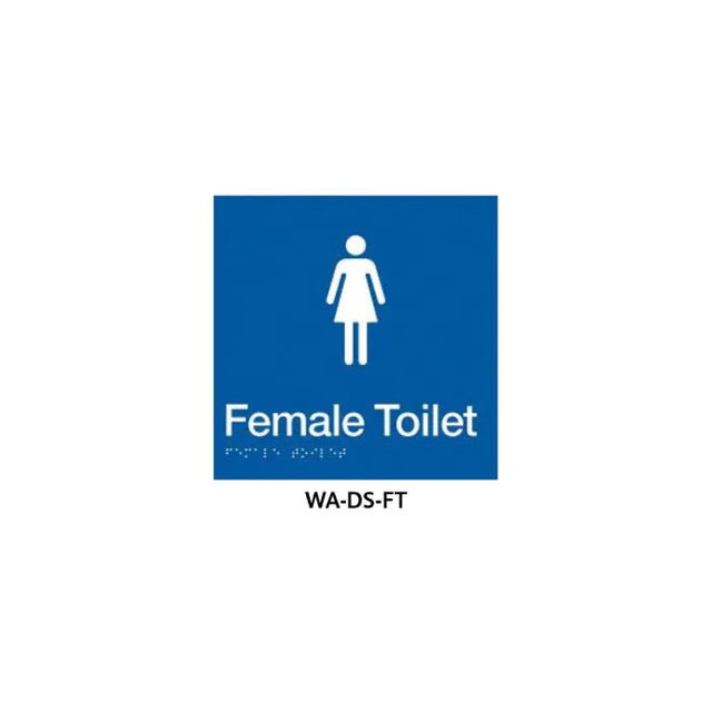 A professionally designed braille signage solution crafted to clearly identify female toilet facilities. Featuring a vibrant blue background combined with tactile braille lettering and high-contrast print, this sign ensures ease of navigation for visually impaired individuals while adhering to stringent accessibility standards in commercial, public, and healthcare settings.