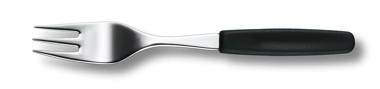 Cake Fork, 11cm - Black by Victorinox is a refined and practical utensil designed for enjoying desserts and snacks. Crafted from durable stainless steel, this cake fork features a polished finish and an ergonomic black polypropylene (PP) handle that offers a comfortable, secure grip.
