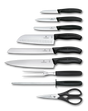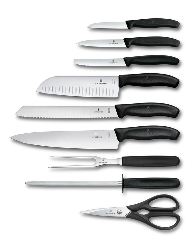 9 Piece Cutlery Block Set - Black by Victorinox is a sophisticated and compact kitchen knife collection designed for versatile food preparation tasks. It includes nine high-precision blades ranging from paring and table knives to a bread knife, Santoku, carving knife, kitchen scissors, and a sharpening steel, all housed in a sleek black block made from durable materials. The ergonomic handles with black polypropylene construction provide excellent grip and comfort for consistent performance.