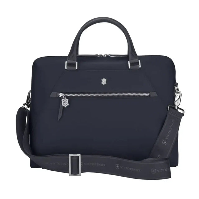 The Victoria Signature 14" Laptop Briefcase Midnight Blue by Victorinox is a sophisticated and versatile briefcase designed for professional women who demand style and functionality. Crafted from premium 210D nylon and leather accents, it features a padded laptop compartment that fits laptops up to 14 inches, along with a dedicated tablet slot. The briefcase offers interior organizational features including multiple compartments, a pen holder, a zipped pocket, and a removable go-to pouch that doubles as a wristlet clutch for added convenience. It can be carried using cushioned leather twin handles or an adjustable, removable branded shoulder strap for comfortable versatility. Additional features include a smart sleeve that fits over trolley handles for easy travel and an interior lining treated with SILVADUR™ technology, which inhibits the growth of microorganisms to keep the bag fresh. The dimensions are approximately 42 cm in width, 30 cm in height, and 13 cm in depth, weighing around 0.8 kg with a capacity near 13 liters. This briefcase comes with a Victorinox 1+10 year warranty, combining premium materials, innovative features, and elegant design for the modern professional