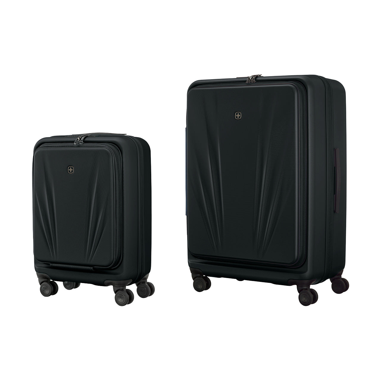 The Skyon Hardside 2pc Set Black is a durable and stylish luggage set designed for modern travelers. The set includes a carry-on and a large suitcase, both featuring a tough polycarbonate hardshell construction that provides excellent impact resistance. It is secured with a Travel Sentry® Approved combination lock and double-coil security zippers for safe travel. The expandable design offers additional packing space when needed. The carry-on case includes a dedicated laptop panel that fits laptops up to 16 inches and tablets up to 12 inches, equipped with USB-A and USB-C charging ports to stay connected while on the go. Both suitcases come with compression straps to secure contents, built-in ID trays for easy identification, and four dual caster wheels for smooth maneuverability. The ergonomic telescopic trolley handles provide comfortable and easy handling. The carry-on measures approximately 54 cm long, 38 cm wide, and 23 cm deep (expandable to 28 cm) with a weight of about 3.47 kg, while the large suitcase measures about 73 cm by 51 cm by 30 cm deep, weighing around 4.76 kg. This black set blends functionality, security, and sleek design ideal for any traveler.