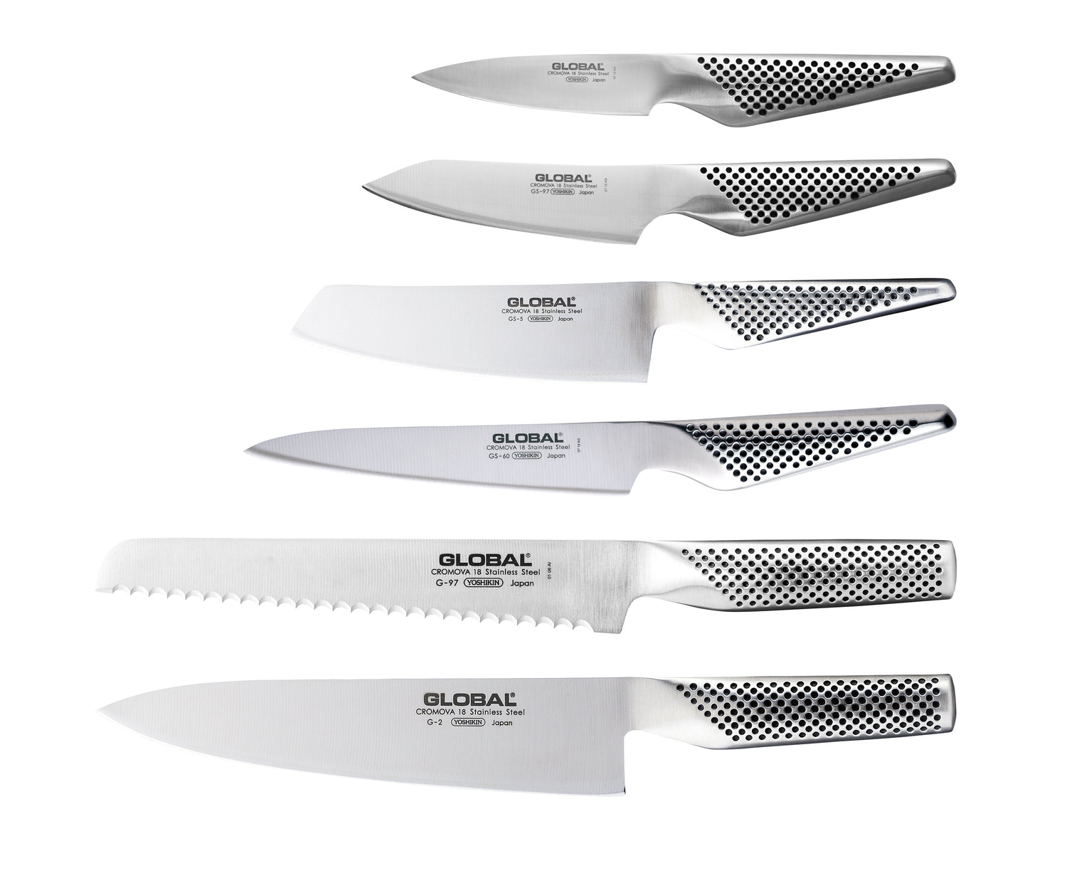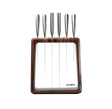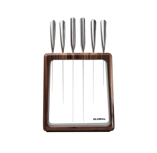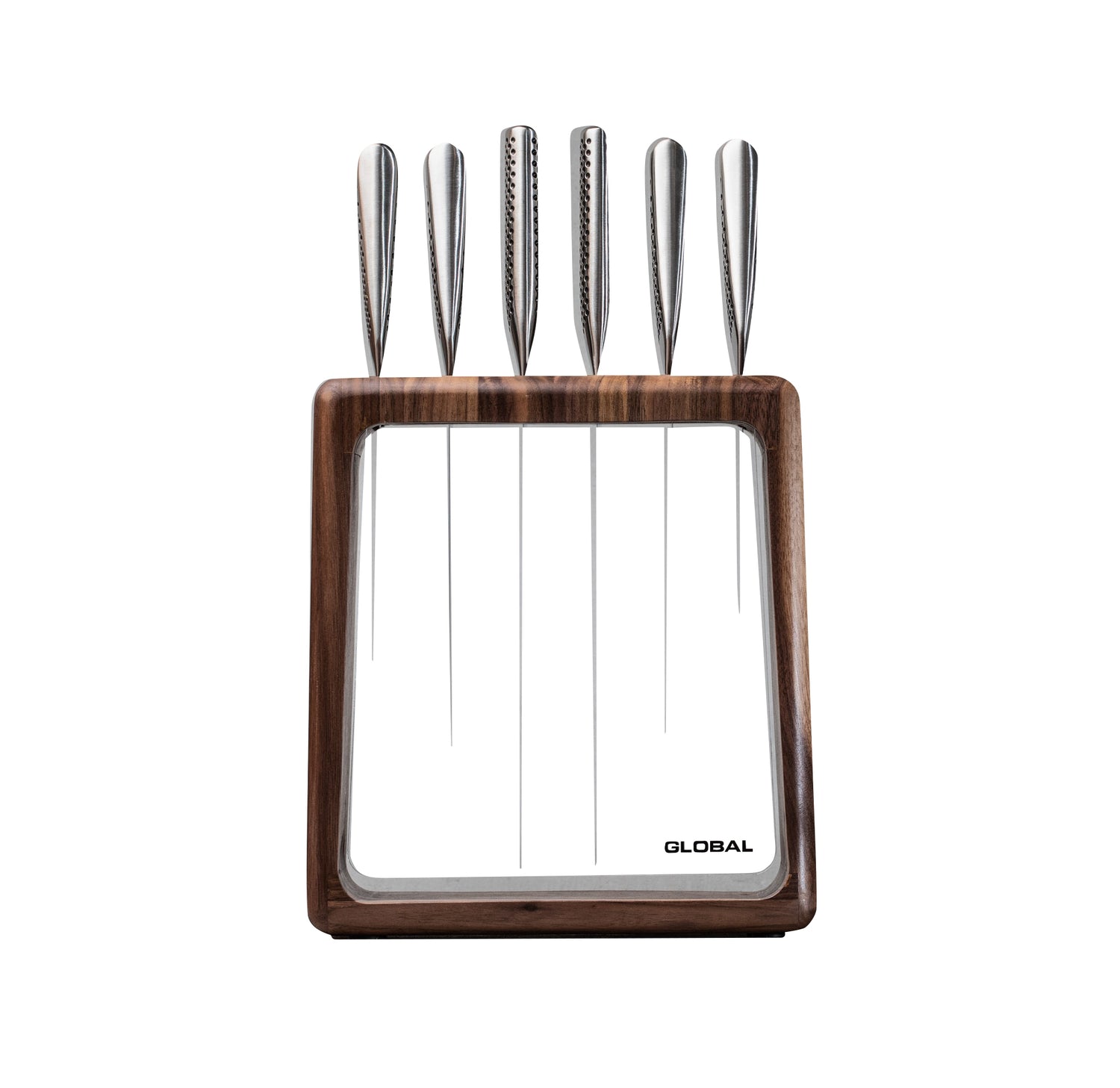 Dimensions: Comprises: Paring Knife 9cm, Oriental Cooks 10cm, Vegetable Knife 14cm, Utility Knife 15cm, Bread Knife 20cm, Cooks Knife 20cm, Walnut Storage Block