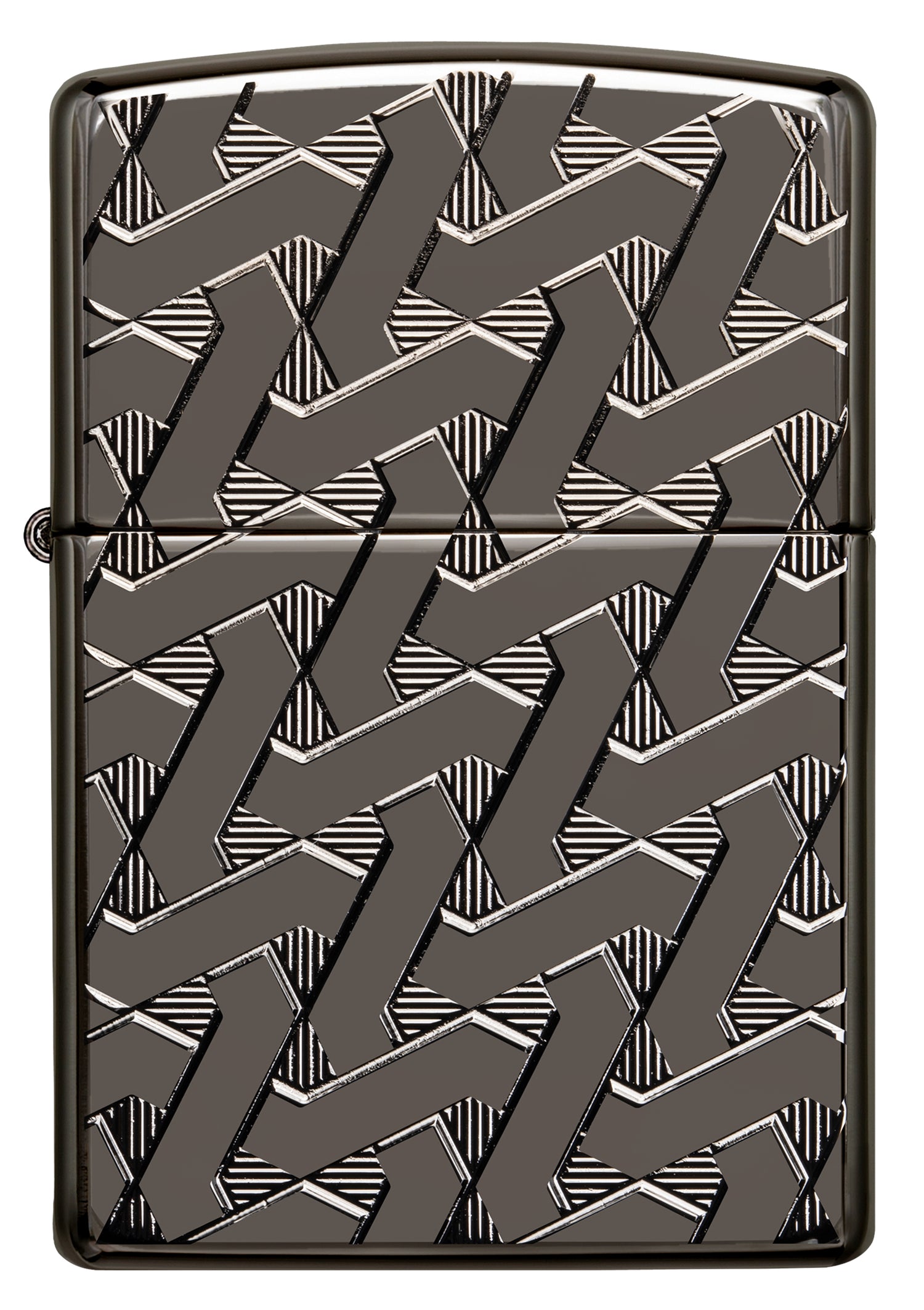 The Zippo Black Ice Mesh Armour lighter features a captivating deep carve geometric mesh weave pattern engraved on the front of the lighter, set on a sleek and sturdy Armor® High Polish Black Ice finish case. This modern design combines bold style with classic Zippo durability.
