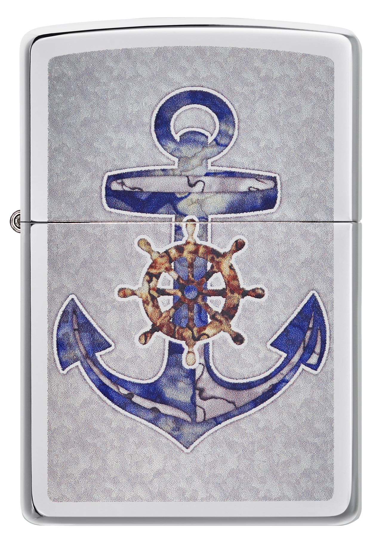The Zippo Anchor Design lighter features a striking nautical anchor paired with a captain's helm, set against an iridescent and metallic high polish chrome finish that evokes maritime spirit and adventure. Perfect for lovers of the sea and classic Zippo craftsmanship.