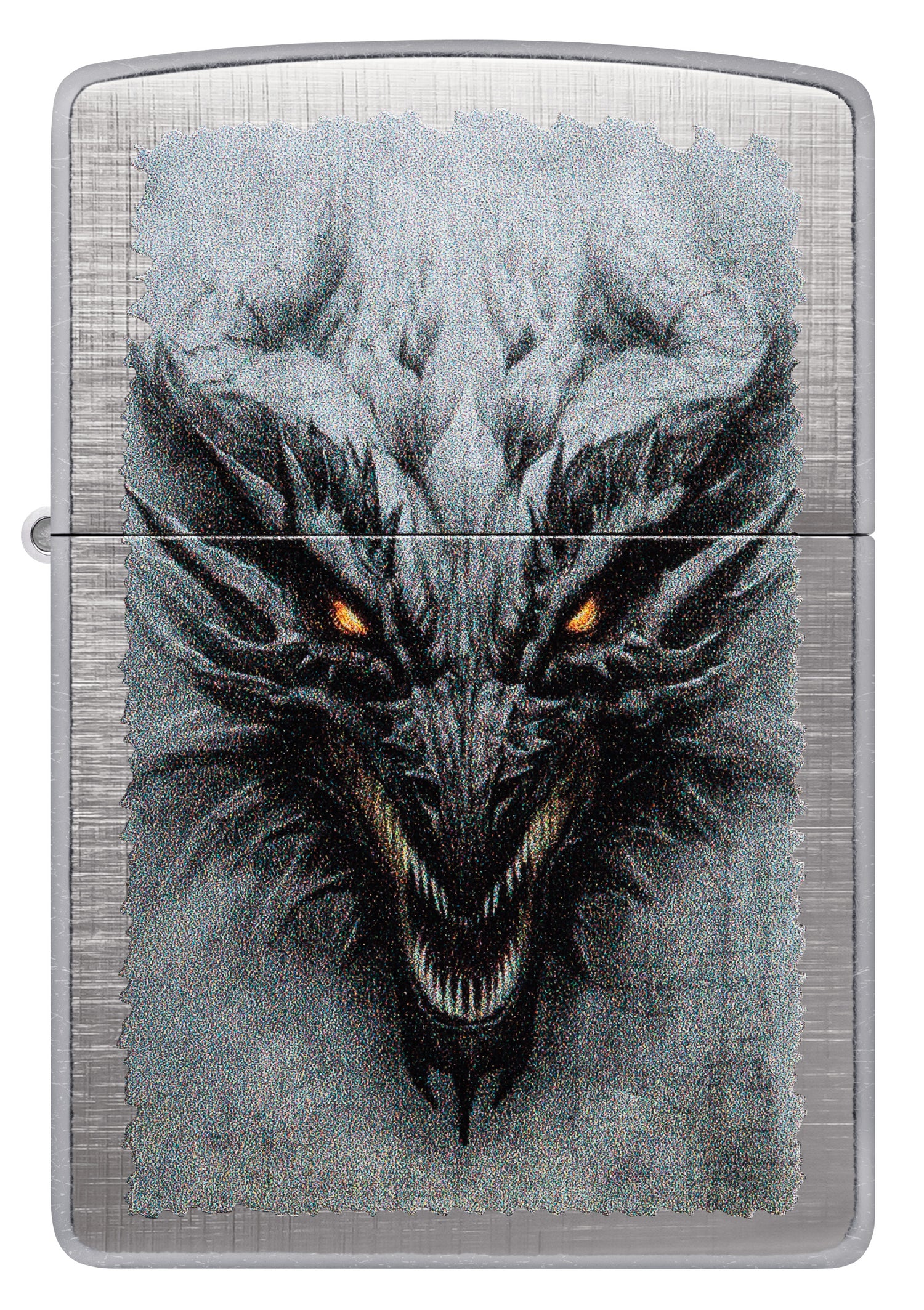 The Zippo Dragon lighter features a bold and captivating fire-breathing dragon design with gleaming red eyes and razor-sharp teeth, presented on a unique linen weave textured matte finish. This striking image appeals to collectors and enthusiasts of mythical and Asian-inspired art.