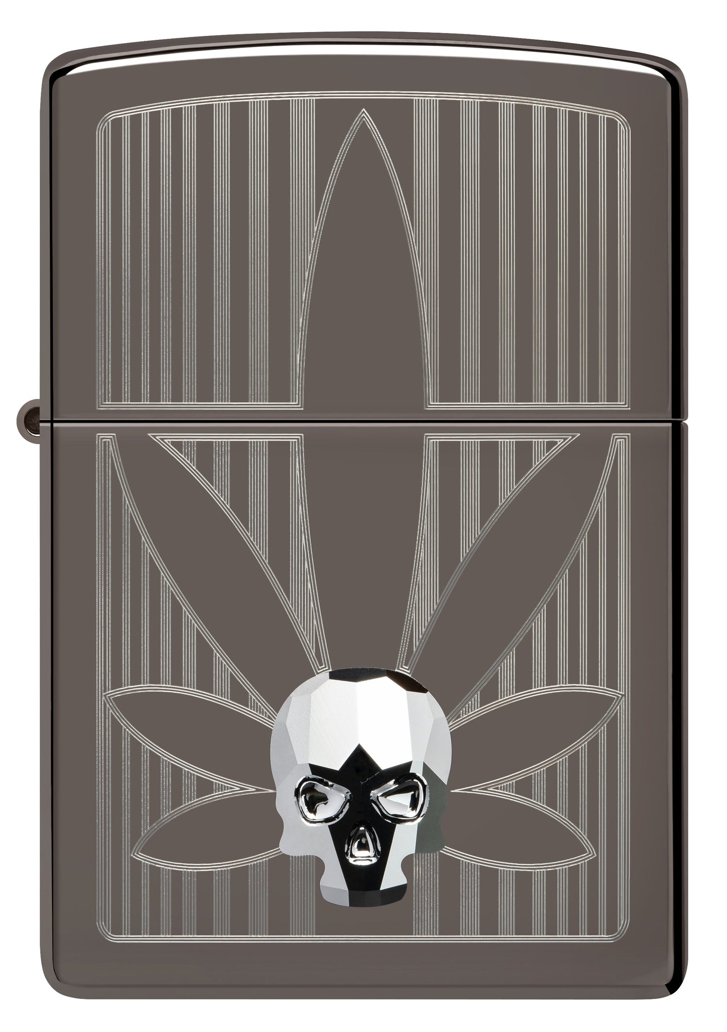 The Zippo Cannabis Skull lighter showcases a striking crystal skull emblem gleaming on a sleek Black Ice® finish, combined with a crisp auto-engraved cannabis leaf design. This distinctive Zippo lighter blends edgy style with reliable performance, perfect for collectors and cannabis culture enthusiasts.