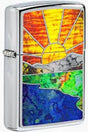 The Zippo High Polished Chrome Sunset lighter features a brilliant and serene sunset scene over a mountain landscape rendered with Zippo’s signature Fusion process that showcases vibrant colors atop a gleaming high polish chrome surface. The reflective chrome finish elegantly complements the fiery sky design.