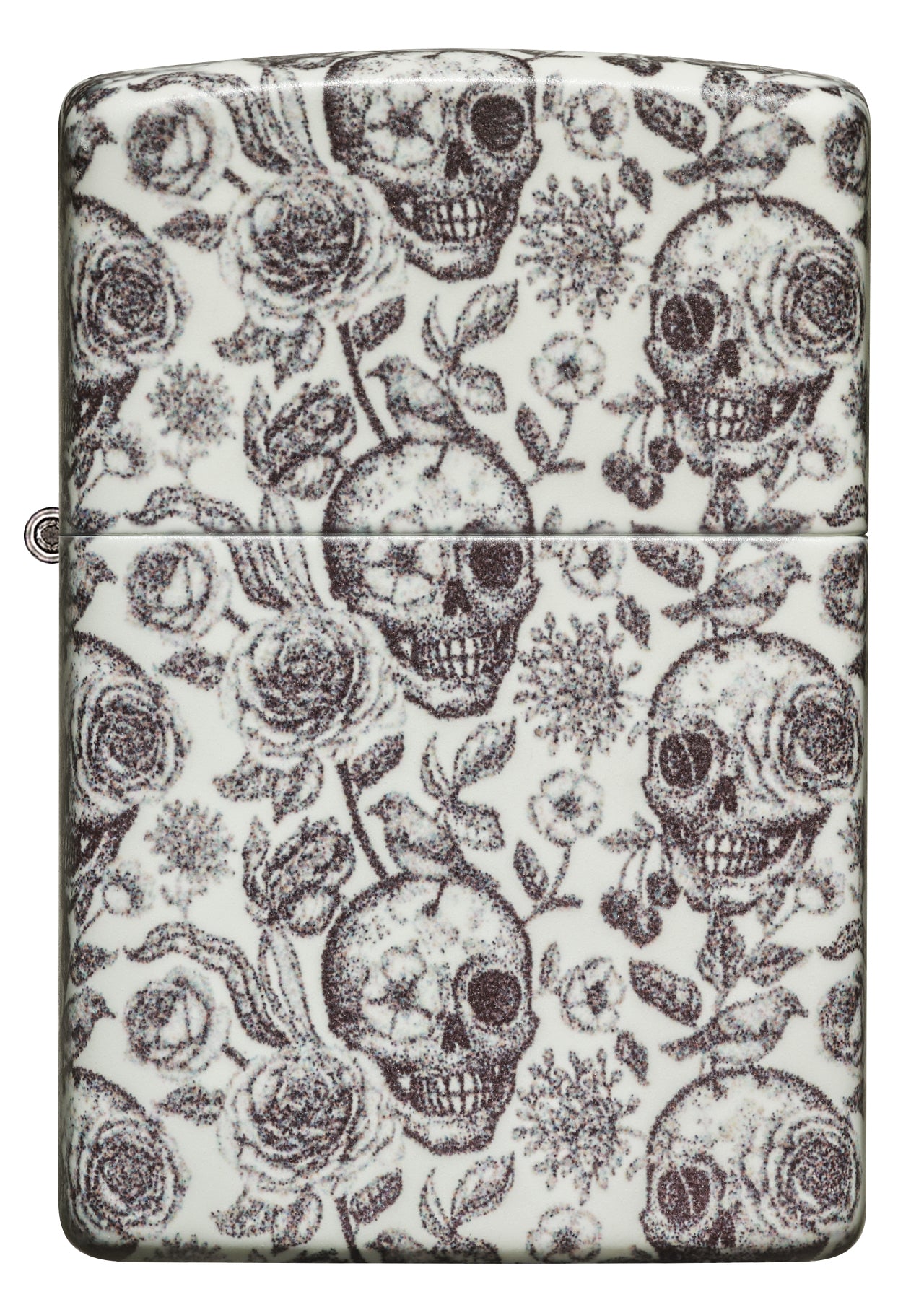 The Zippo Skeleton Design Glow in the Dark lighter showcases a beautifully haunting floral skeleton motif intricately covering the entire lighter using Zippo’s advanced 540 Colour Image process for complete surface artwork. When the lights go out, this unique design glows with an eerie, captivating luminescence, making it a standout piece for collectors.