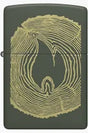 The Zippo Wood Ring Design lighter features a unique laser-engraved design mimicking the natural rings of a tree trunk centered around the iconic Zippo flame logo, set on a distinctive green matte finish. This design appeals to nature lovers and those appreciating detailed craftsmanship.