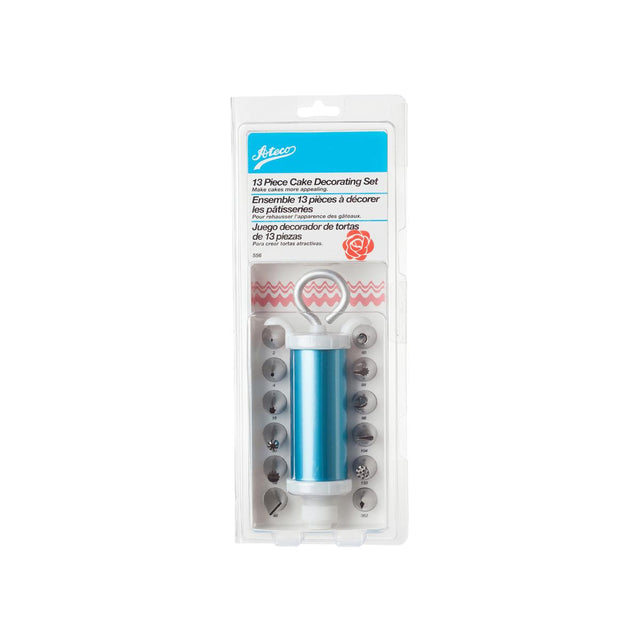 13-Piece Decorating Set is a comprehensive cake decorating kit perfect for both novice and experienced bakers looking to create professional-quality designs. This set typically includes a sturdy decorating syringe made of anodized aluminum holding about 3.5 fluid ounces, a plastic spout cap, and wing cap for easy icing control. It also comes with 12 stainless steel decorating tips that cover a variety of piping styles such as stars, flowers, borders, shells, leaves, and writing tips, allowing for versatile decorating options. The components are crafted for durability and ease of use, with tips designed to fit securely onto the syringe or reusable pastry bag. Ideal for detailed cake decoration, cupcake embellishment, and pastry finishing, this set empowers users to execute intricate designs with precision. The kit often includes multilingual instructions and icing recipes, enhancing user experience. Its compact design ensures easy storage, and the materials are easy to clean, some even being dishwasher safe.