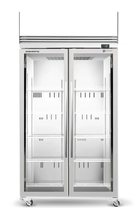Boost your commercial kitchen or retail space's frozen product visibility with the Skope TMF1000N-AC Two Glass Door Display Freezer with Lit Sign, a high-performance and energy-efficient commercial upright freezer designed to deliver superior frozen storage and captivating product presentation. This robust unit offers a spacious 980-litre gross volume encased in a durable powder-coated galvanised steel body, built to withstand the demands of busy foodservice and retail environments. It features two self-closing, lockable frameless glass doors constructed with triple-glazed, Low-E argon-filled toughened safety glass, providing excellent insulation, minimized condensation, and clear, attractive frozen product display.