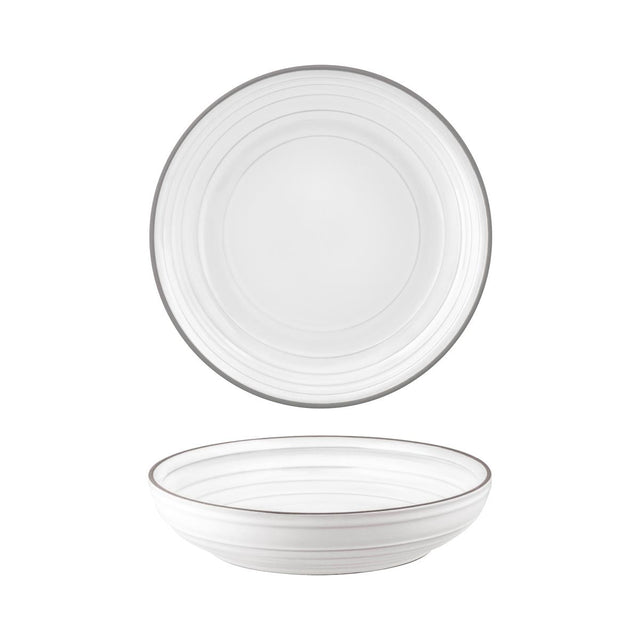 Tablekraft Linea Pasta/Soup Plate 220x50mm White (Sold in sets of 4) is a versatile and elegant plate featuring a 220mm diameter and 50mm depth, designed specifically for serving pasta, soups, and hearty dishes. Crafted from durable vitrified porcelain with a reactive glaze, this plate offers unique, handcrafted character with sophisticated linear detailing that enhances table presentation. With a generous capacity of approximately 1220ml, the plate is both microwave, dishwasher, and oven safe, ensuring convenience and durability in busy commercial kitchens. Ideal for cafes and restaurants, it combines functionality with refined aesthetics to complement modern and classic table settings